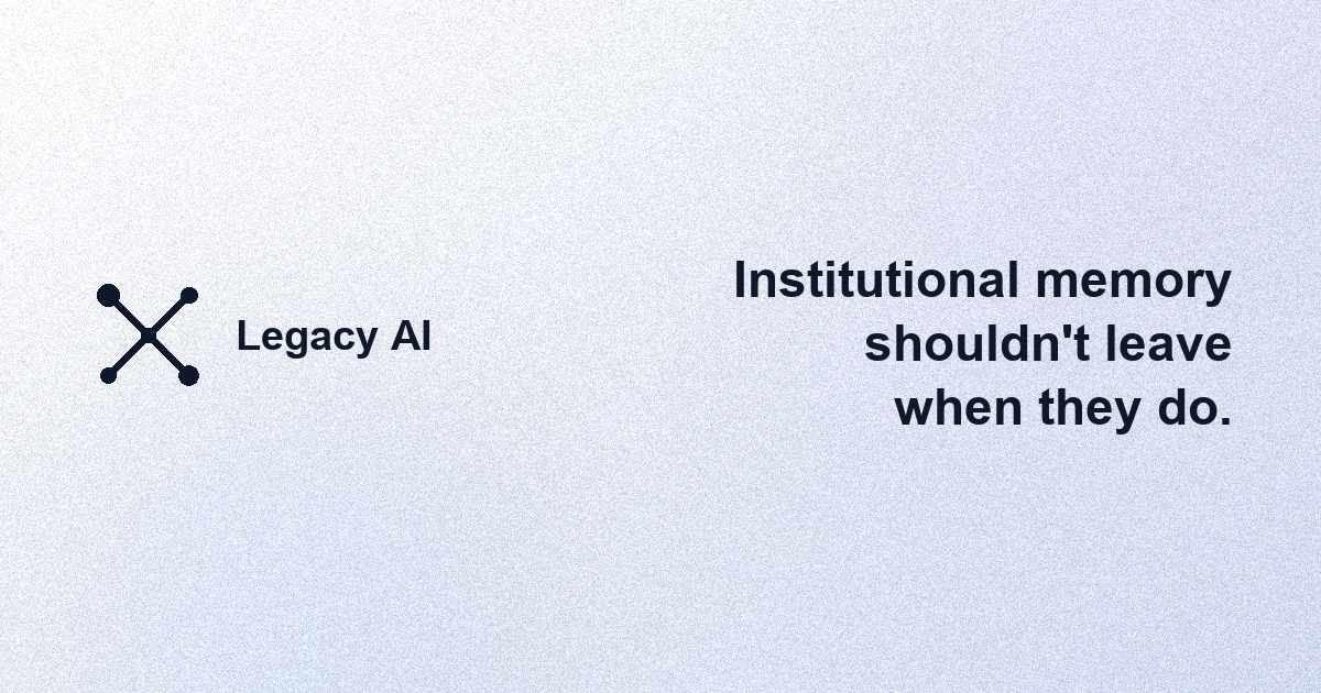 Legacy AI is an AI-powered knowledge preservation platform that captures, structures, and resurfaces institutional memory before it walks out the door. Built as a multi-tenant SaaS with role-based access, it combines conversational AI interviews, automated knowledge extraction, and semantic search to turn tacit expertise into a searchable, living knowledge base — so organizations never lose critical know-how when key people leave.
